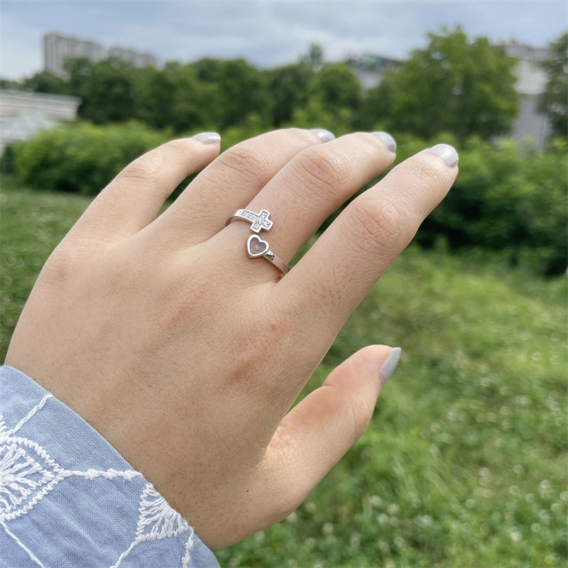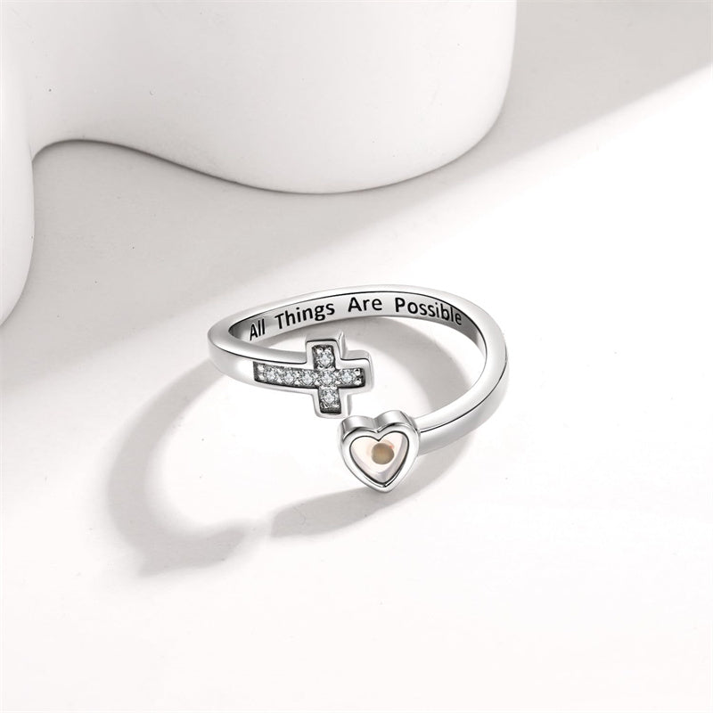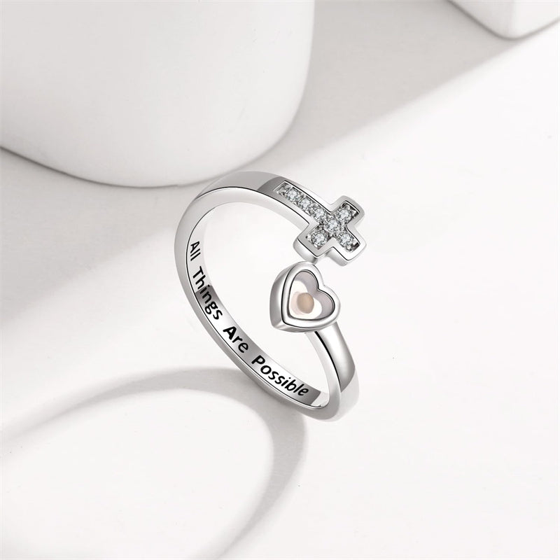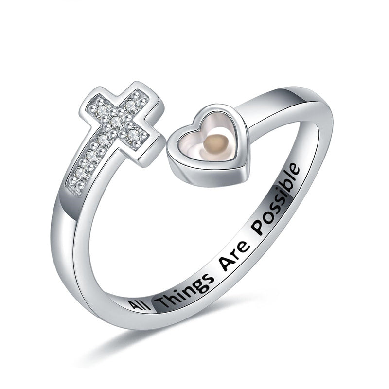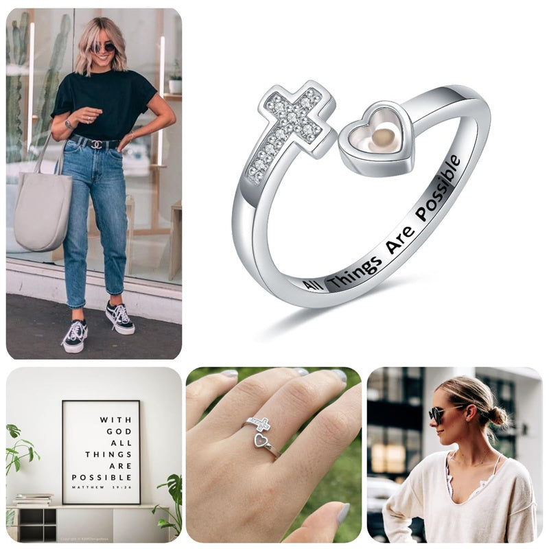 Adjustable Wrap Design: Heart and cross bypass band with Inspirational message All Things Are Possible engraved,the letters are filled with black enamel,easy to read.