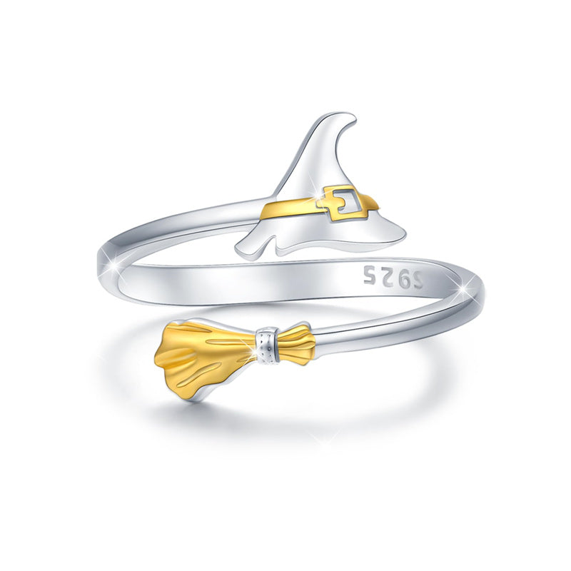 Witch Ring 925 Sterling Silver Witch Cap Broom Adjustable Ring Halloween Ring for Women Gothic Broom Thumb Ring Witch Hat Open Ring Halloween Jewelry