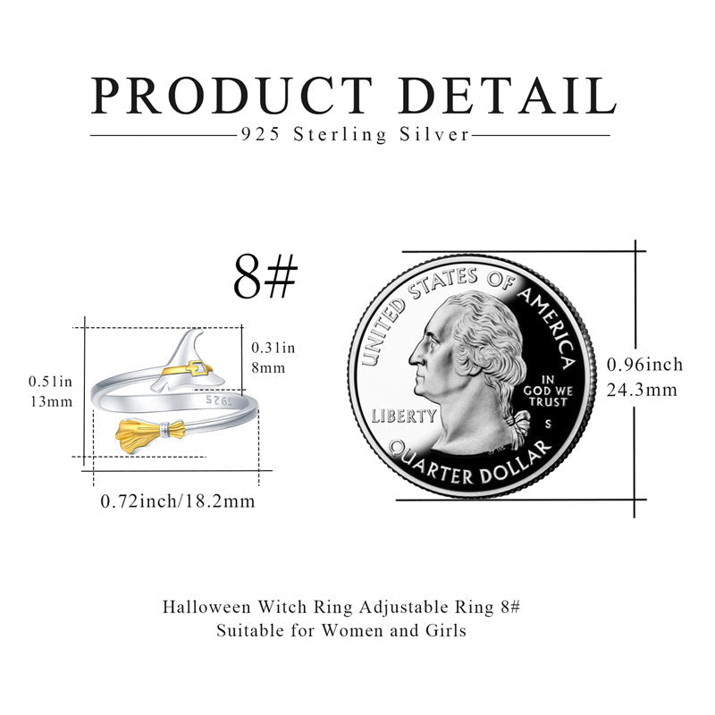 【Size of Witch Cap Broom Ring】Witch Broom Ring for Women size is USA Size 8# (Diameter: 0.72 inch). Adjustable Halloween ring suitable for size 7-9 finger circumference. Witch's magic hat ring Pls kindly adjust lightly to prevent from being deformed by external forces.